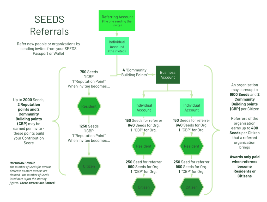 - When your Seedling reaches the next level in their journey in the Game of SEEDS, they will feel excited, and you will be rewarded for it! Check the infographic for the current amounts paid out to you for both resident and citizen level. These rewards are paid out only when your invited one achieves the next steps. Don’t be mistaken. This is not Multi Level Marketing. Those schemes concentrate wealth, but SEEDS offers a gifting economy that continues to circulate through the system.